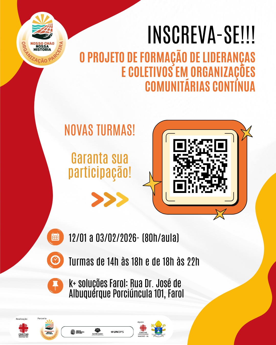 Estão abertas, de 12 de dezembro a 02 de janeiro de 2026, as inscrições para novas turmas do curso “Organização Comunitária para Constituição de OSCs, Desenvolvimento de Projetos de Reparação, Participação Popular e Controle Social”, realizado pela Cáritas Brasileira Regional Nordeste 2, em parceria com a Cáritas Arquidiocesana de Maceió e Arquidiocese de Maceió.